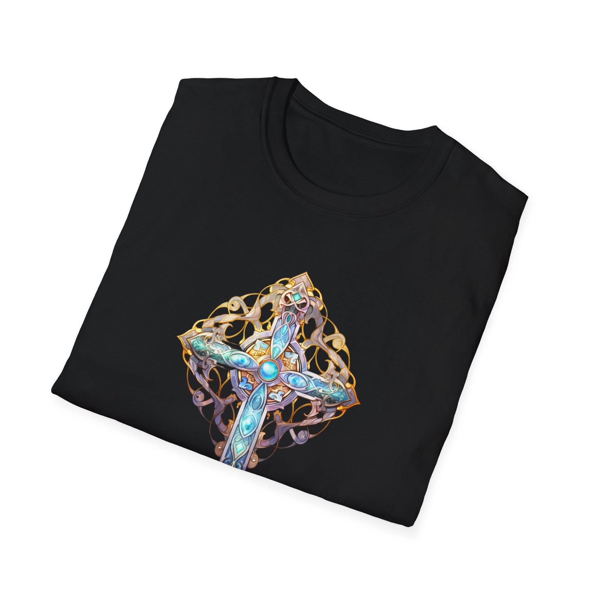 A lightweight, year-round tee built for comfort and quiet statement. This softstyle cotton shirt carries a detailed, jewel-toned cross motif at the chest — ornate filigree, weathered metal tones, and touches of turquoise and gold that look handcrafted. It sits cleanly on the body with a classic crew neckline and tubular knit construction that keeps the silhouette smooth. Wear it layered under a cardigan for contemplative mornings, or loose with jeans when you want breathability and subtle artistry in your outfit. The printed inner neck and optional sleeve details keep the exterior minimal while offering quality that lasts wash after wash.