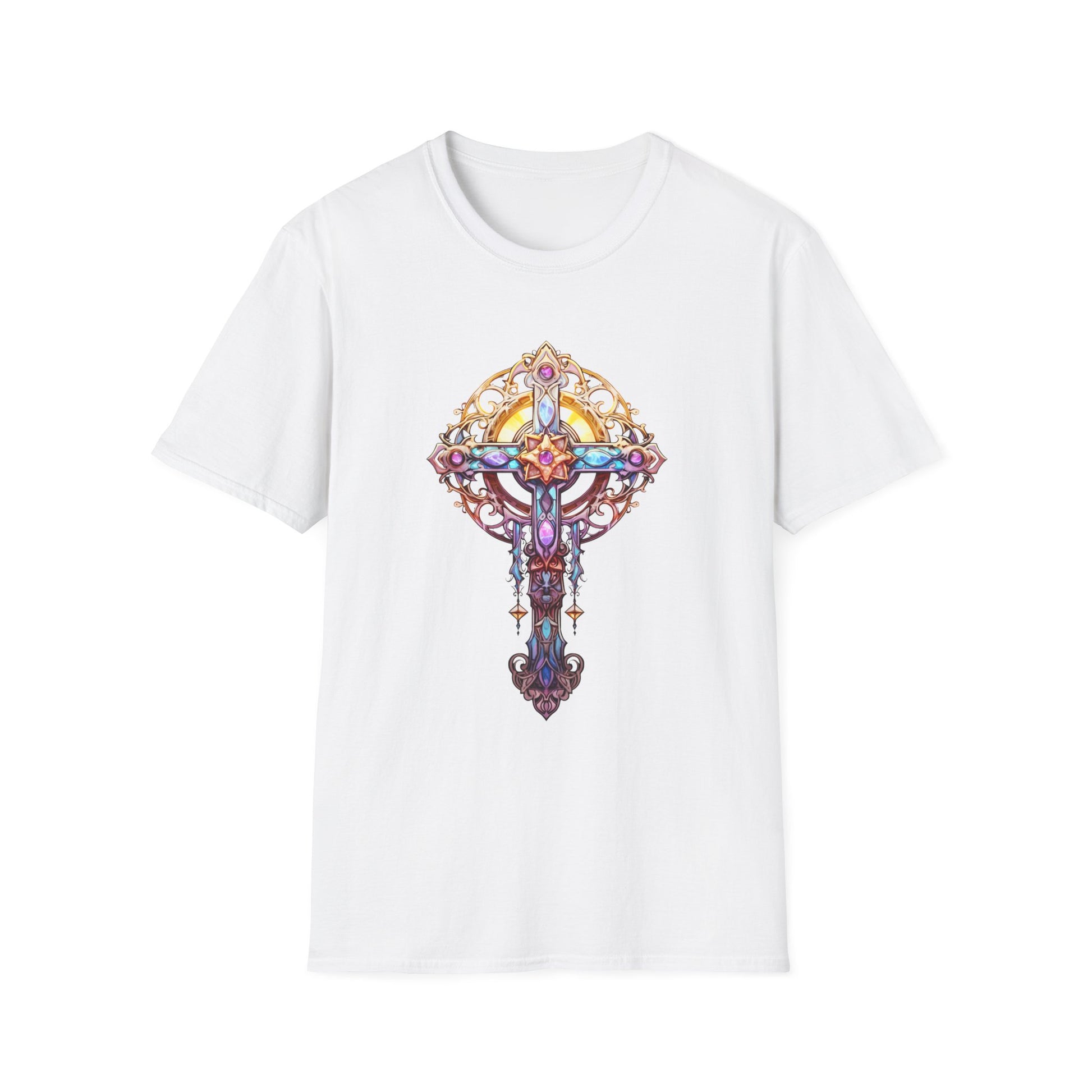 This lightweight tee wears like a second skin and carries a small, detailed jewel-toned cross print that feels quietly sacred. Soft ring-spun cotton with a clean crew neckline keeps the silhouette simple so the ornate artwork can speak. Wear it layered under a worn denim jacket for market mornings, or by itself when you want a single, thoughtful piece that hints at story and reverence. The image sits centered on the chest — colorful yet refined — giving a handcrafted, stained-glass vibe without overwhelming your outfit. Breathable, durable, and understatedly expressive, it settles into everyday life and keeps its shape wash after wash.